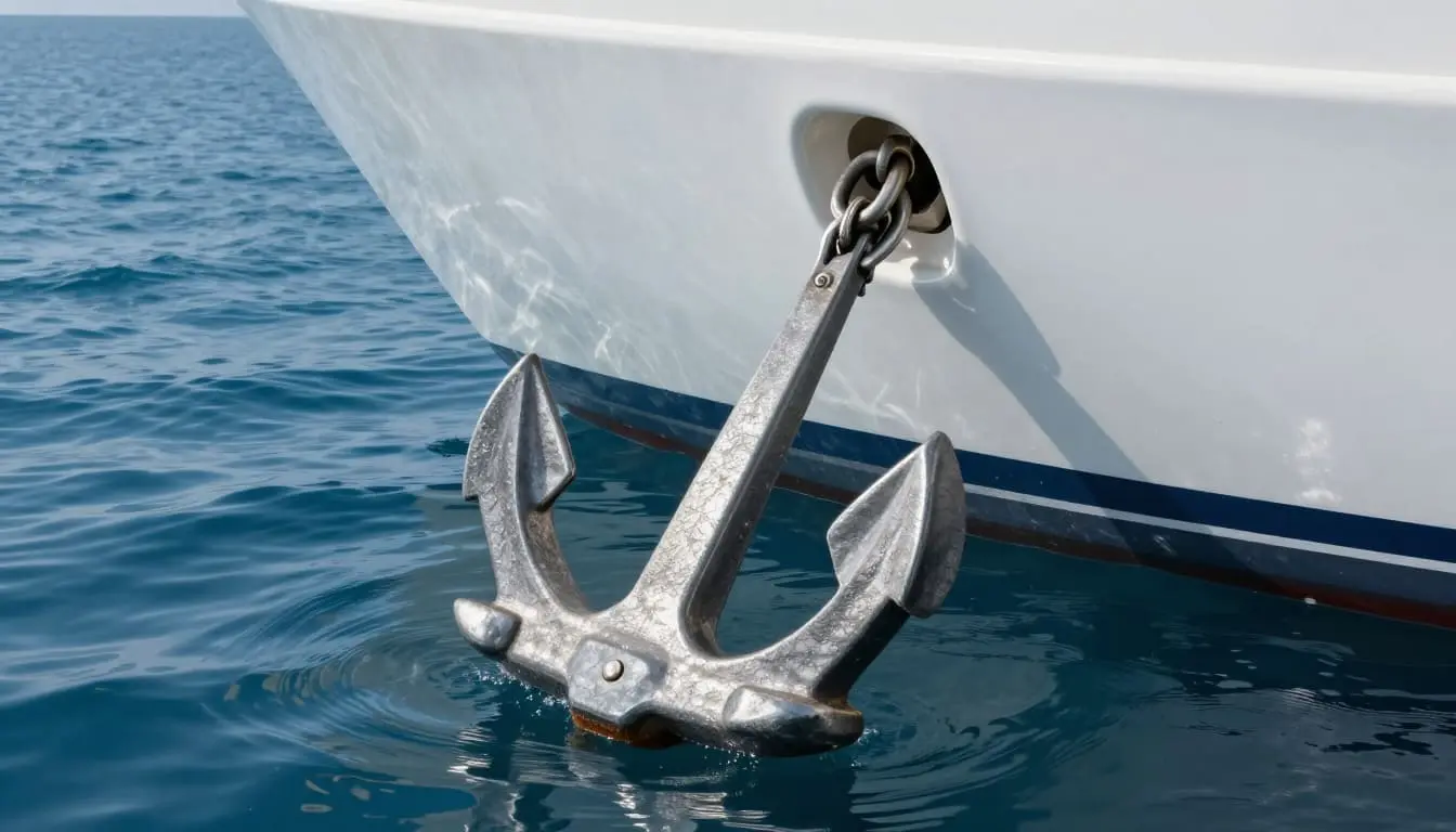 An anchor is dropped to the seabed to hold the yacht steady when it is not moving. It prevents drifting due to wind or current.