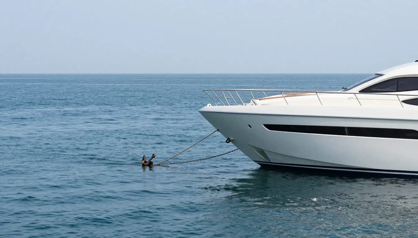 “At anchor” means the yacht is stopped in open water using an anchor instead of being docked at a marina.