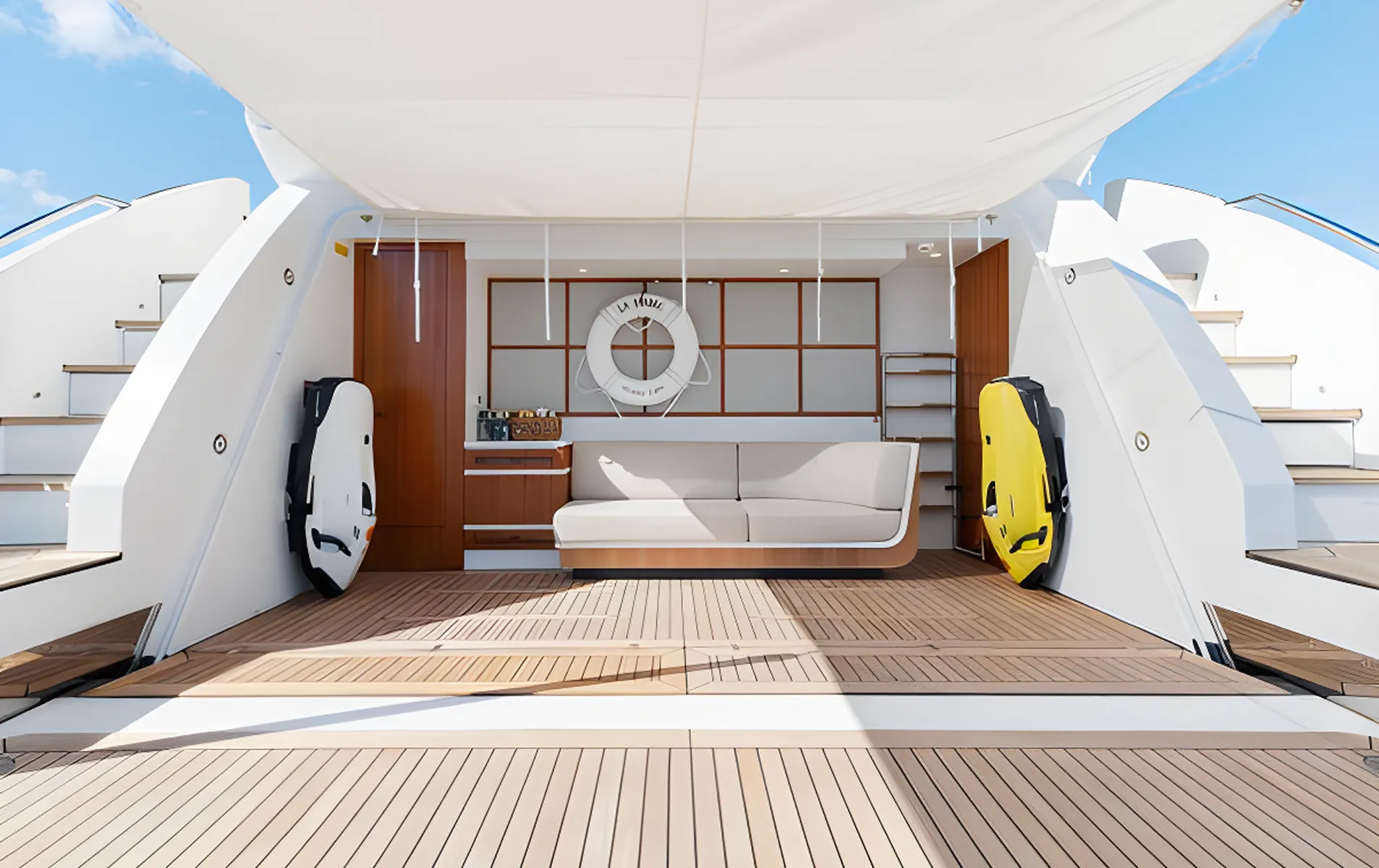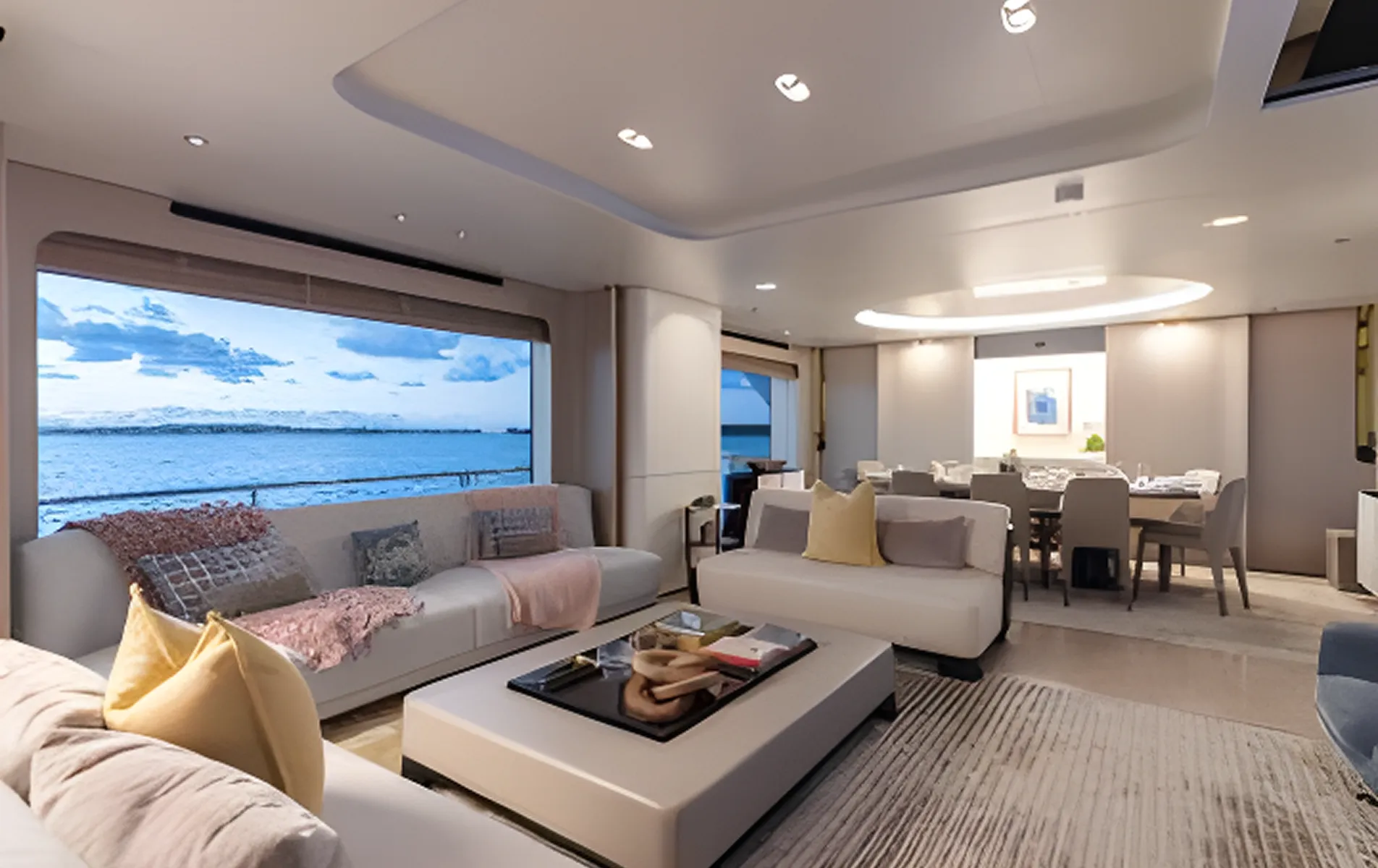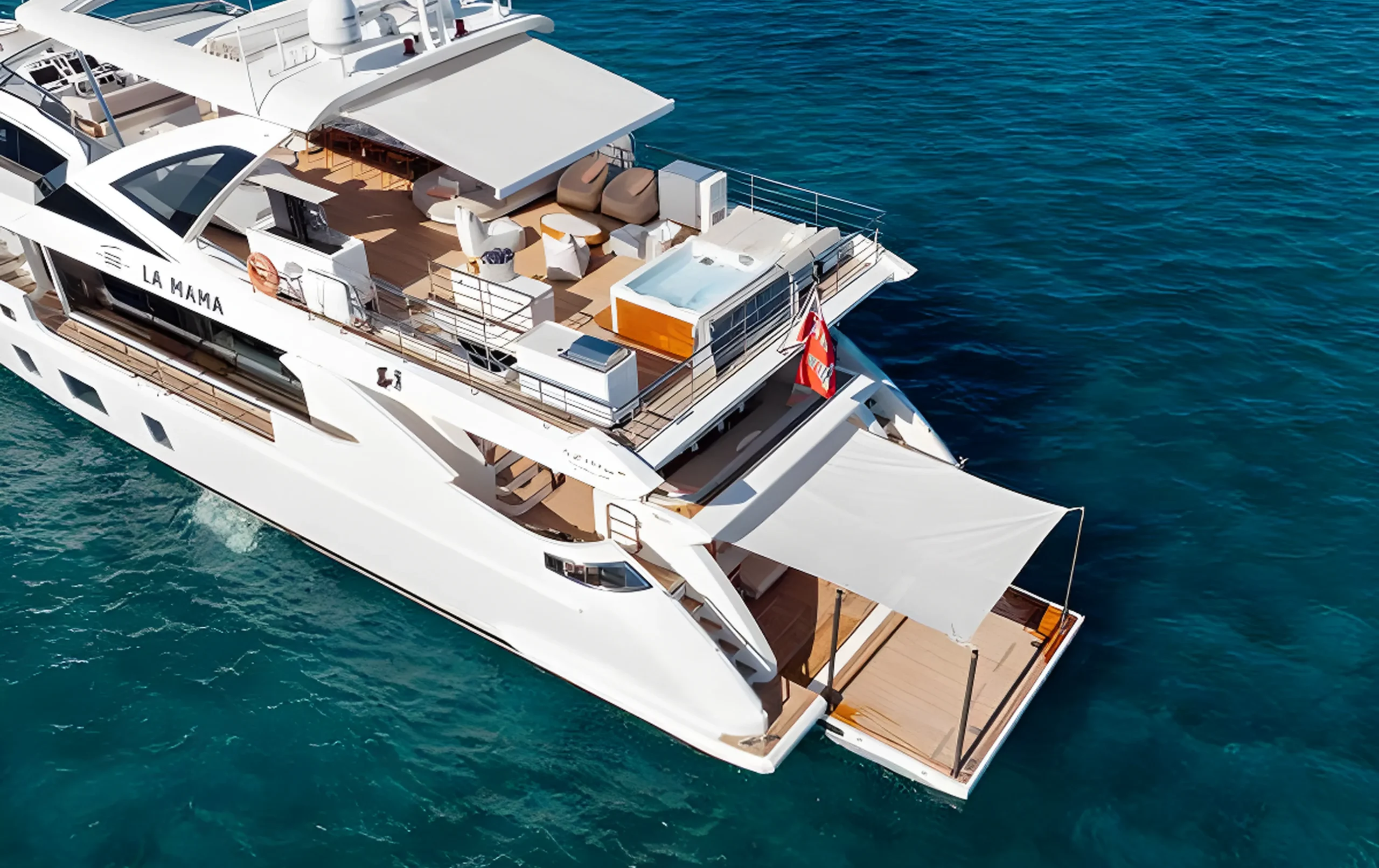 Expansive glazing, full-height windows, and a calm organic interior palette create a serene onboard atmosphere. Designed for ultra-VIP private cruising or luxury charter, LA MAMA offers generous outdoor entertainment zones, a fully equipped beach club, a main-deck ownerโs suite, and long-range cruising capability.