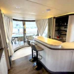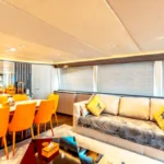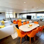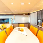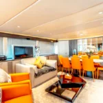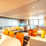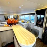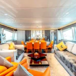 The interior boasts rich wood finishes, elegant furnishings, and state-of-the-art amenities, creating a warm and inviting atmosphere onboard that balances style with functionality.