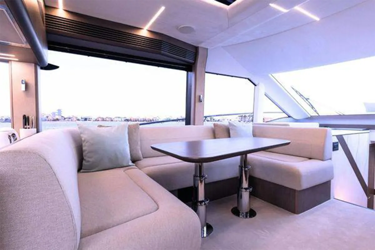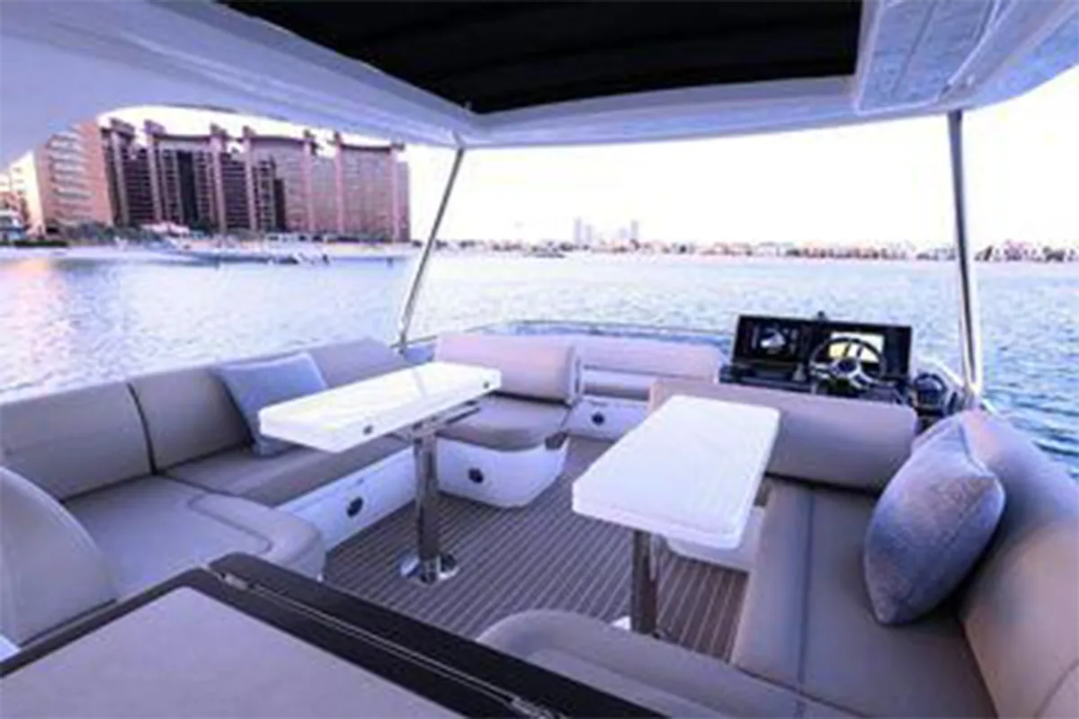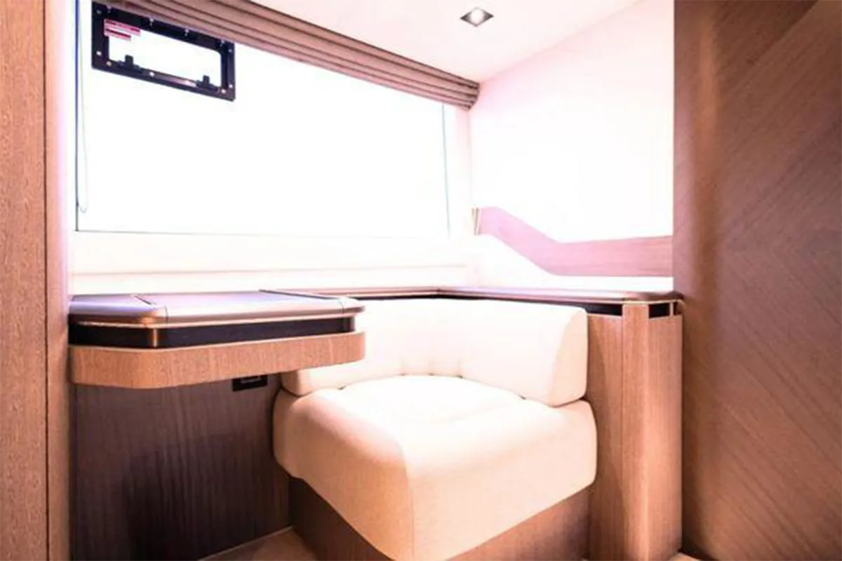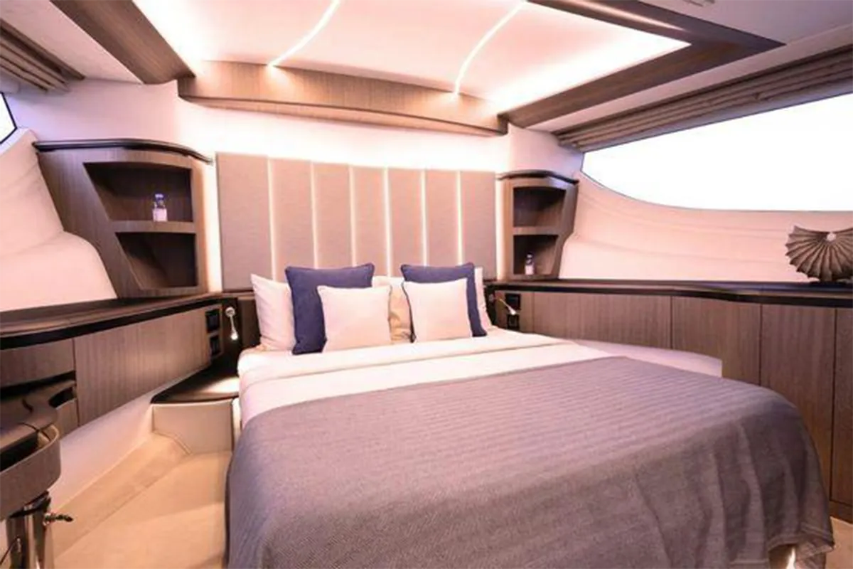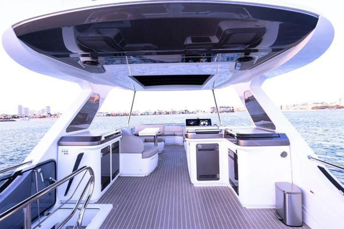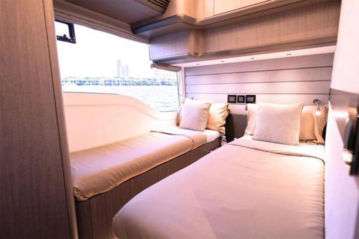 Designed with entertaining and comfort in mind, the flybridge offers a spacious layout featuring dual U-shaped seating areas, electric roof, grill, fridge, and an expansive aft lounging space. Below deck, the three-cabin layout provides generous accommodation including a master cabin, VIP cabin, twin guest cabin, and crew cabin.