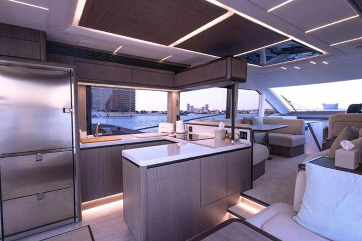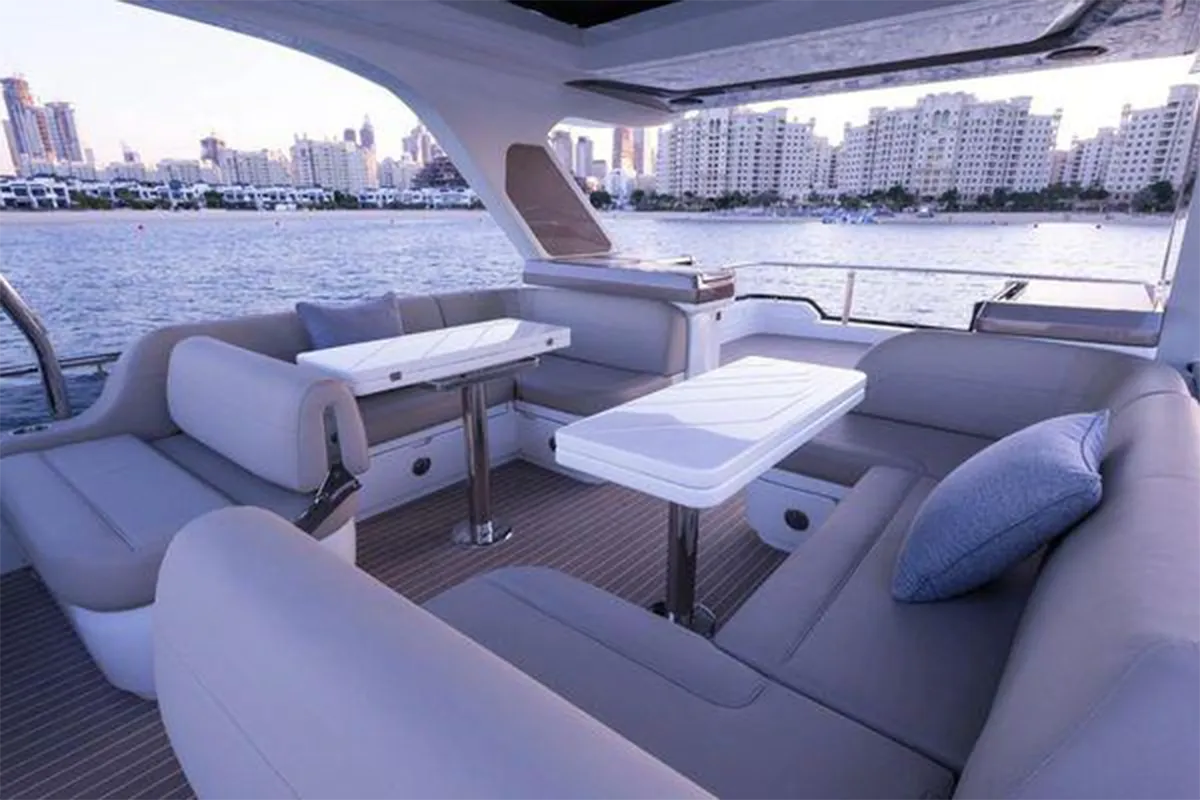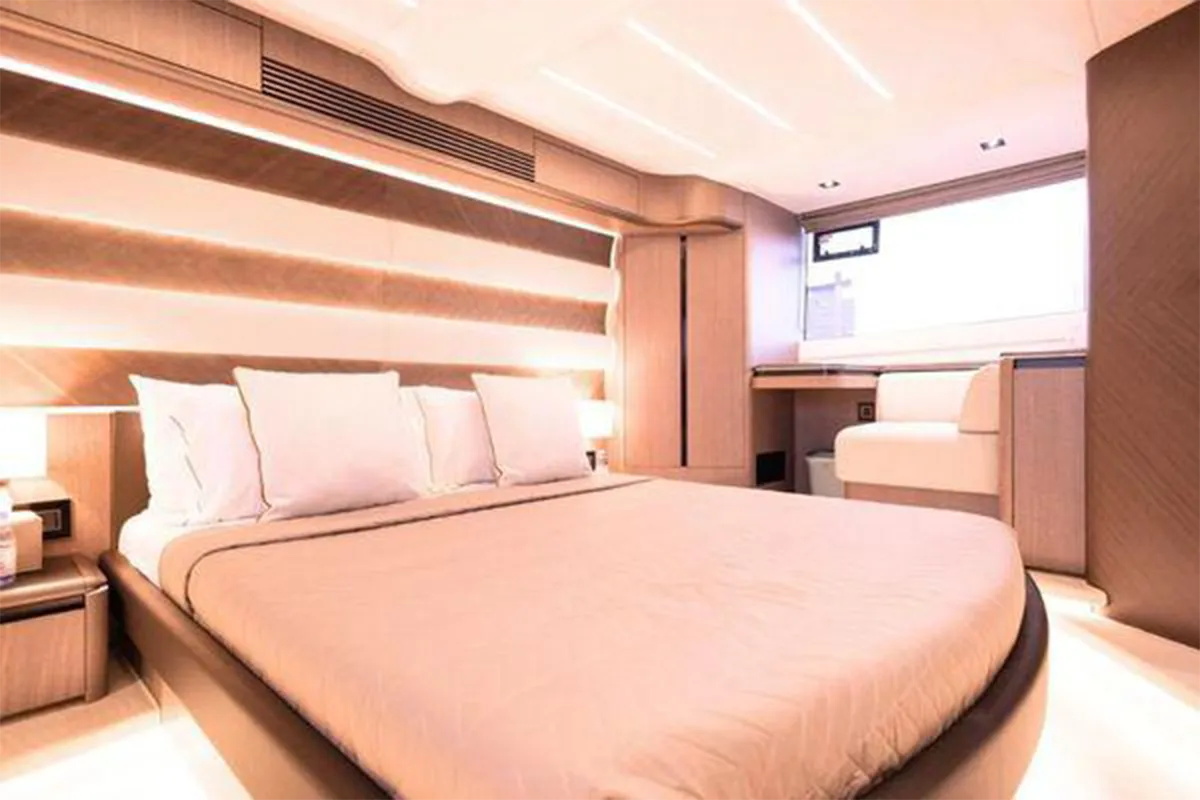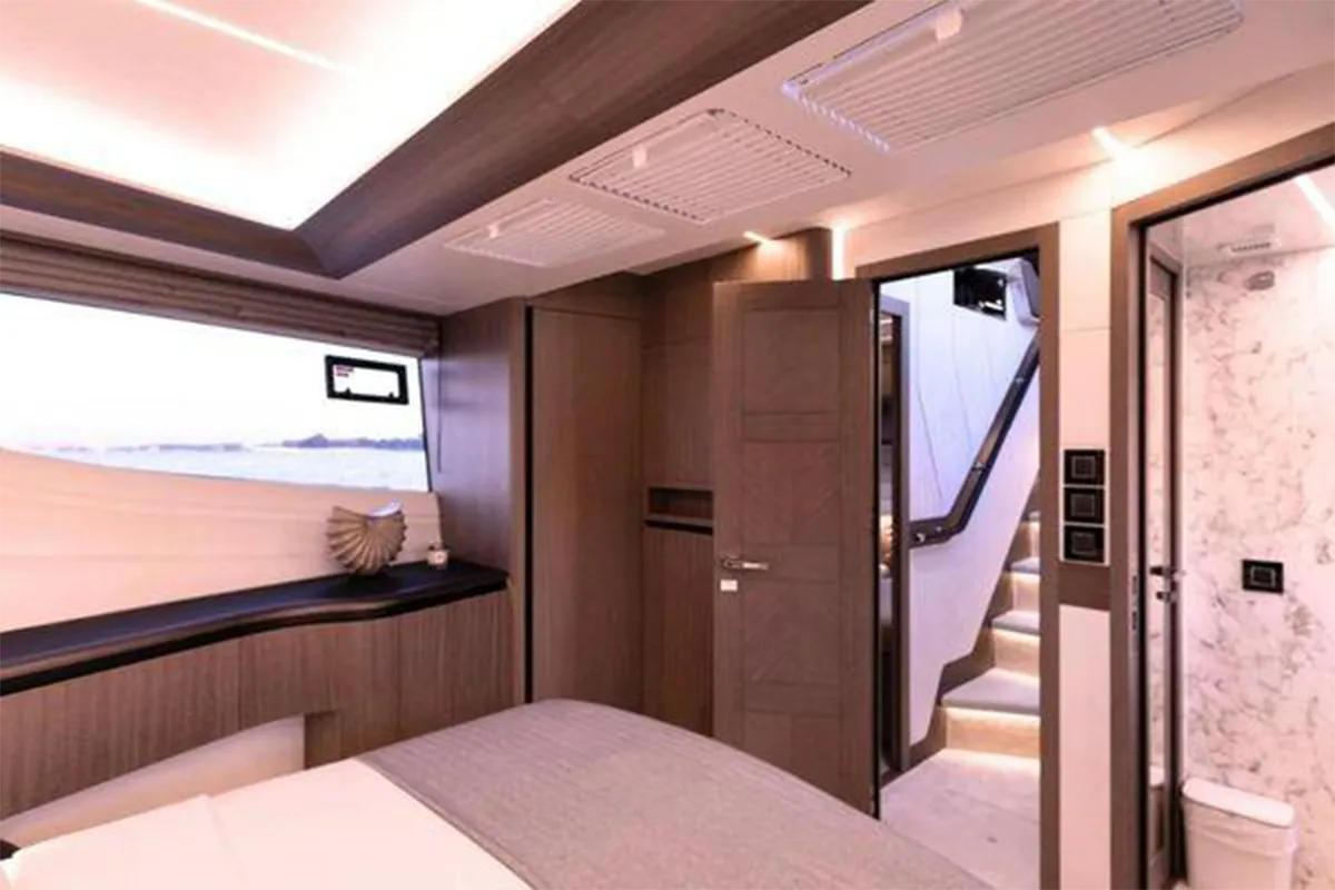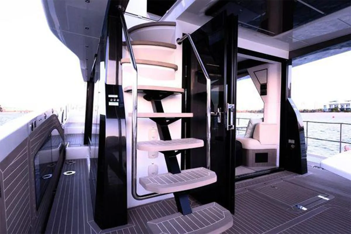 Designed with entertaining and comfort in mind, the flybridge offers a spacious layout featuring dual U-shaped seating areas, electric roof, grill, fridge, and an expansive aft lounging space. Below deck, the three-cabin layout provides generous accommodation including a master cabin, VIP cabin, twin guest cabin, and crew cabin.