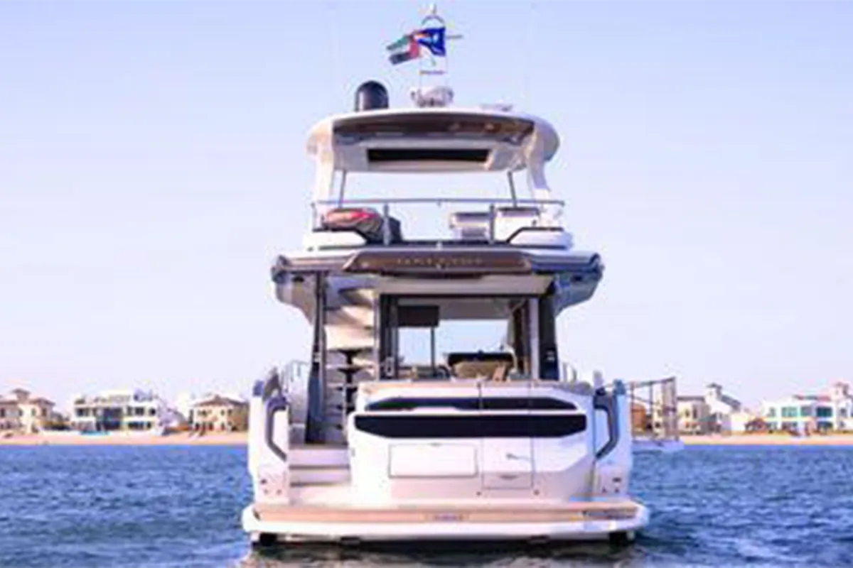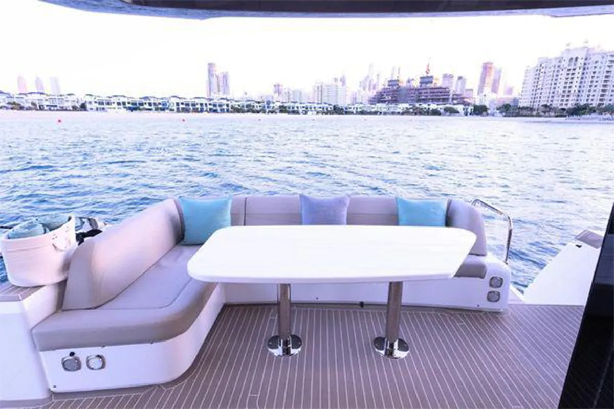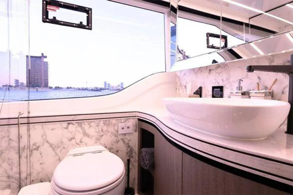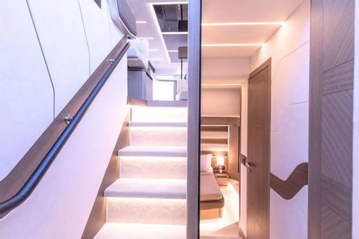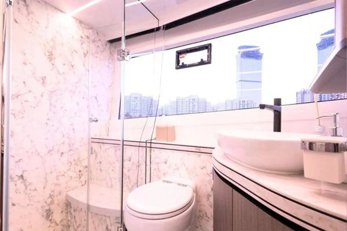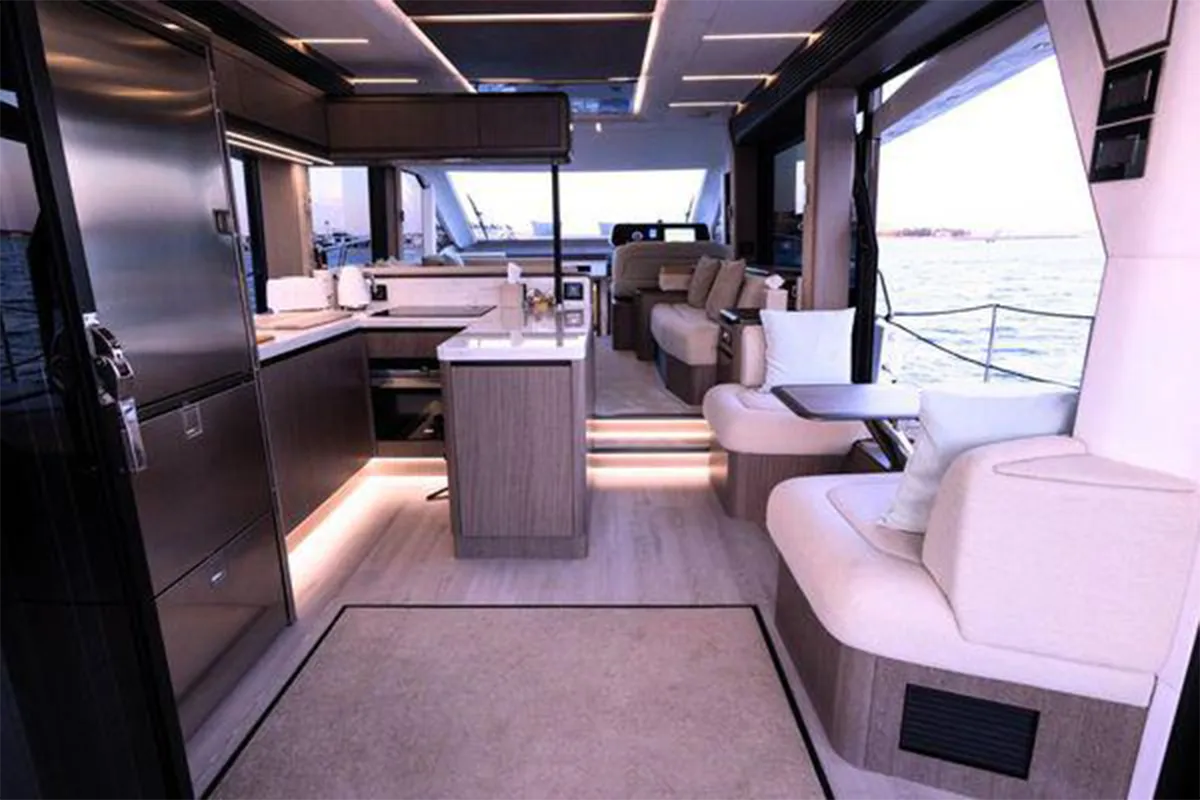 Designed with entertaining and comfort in mind, the flybridge offers a spacious layout featuring dual U-shaped seating areas, electric roof, grill, fridge, and an expansive aft lounging space. Below deck, the three-cabin layout provides generous accommodation including a master cabin, VIP cabin, twin guest cabin, and crew cabin.