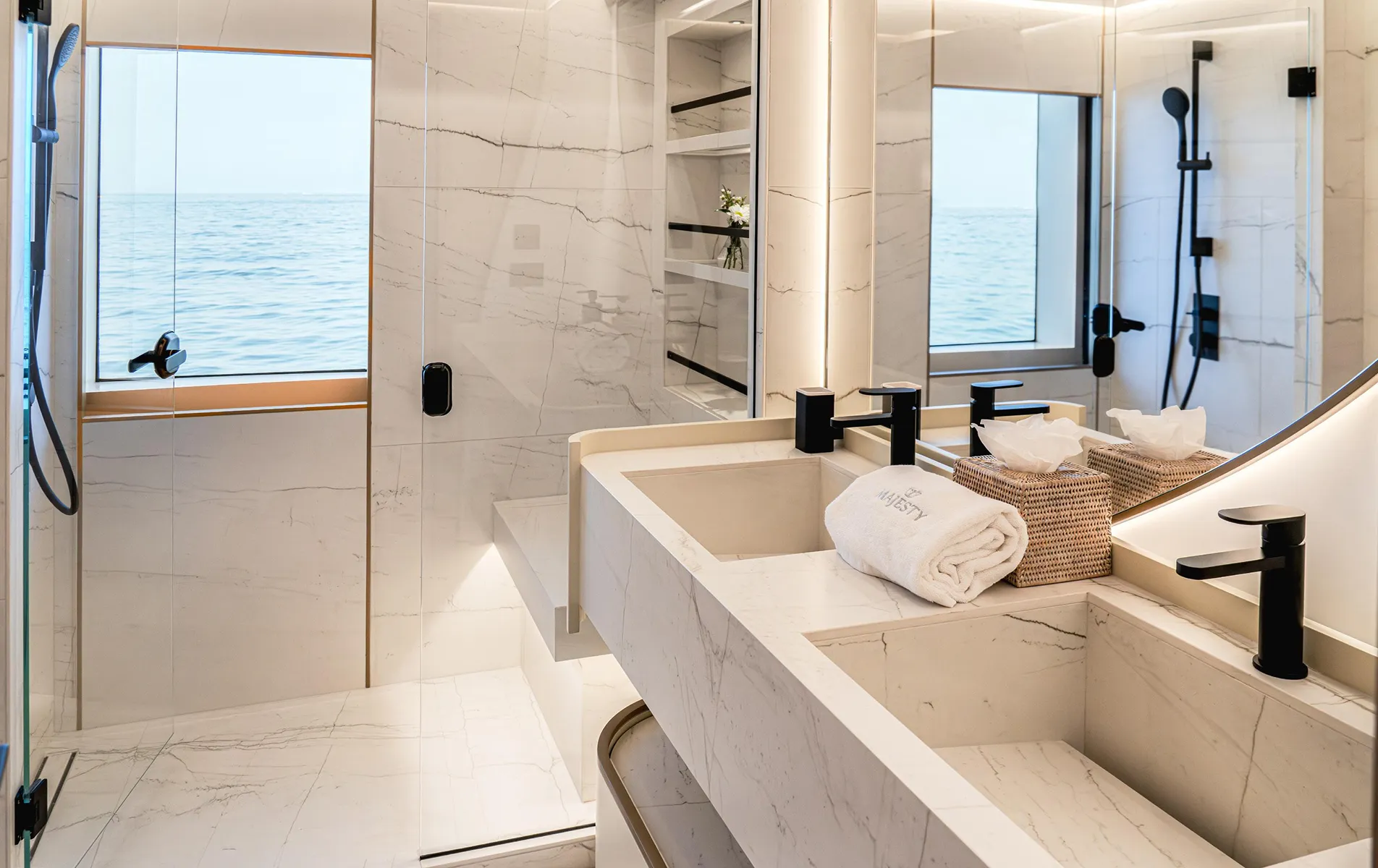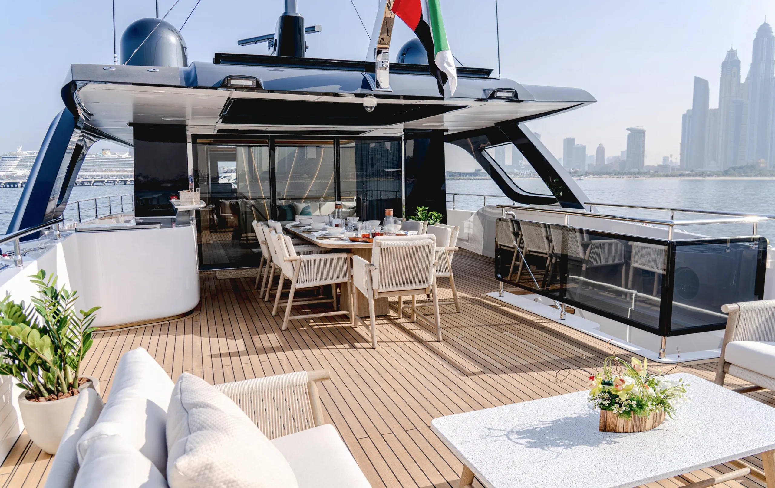 Designed with expansive outdoor living areas, full-height glass salon doors, panoramic windows, and a jacuzzi-ready sun deck, the Majesty 100 Terrace provides a true superyacht experience for both private owners and premium charter operations. Built using Gulf Craftโs advanced lightweight composite construction, she is optimized for efficient cruising and shallow-water capability, making her ideal for the Mediterranean, GCC, and Caribbean.
