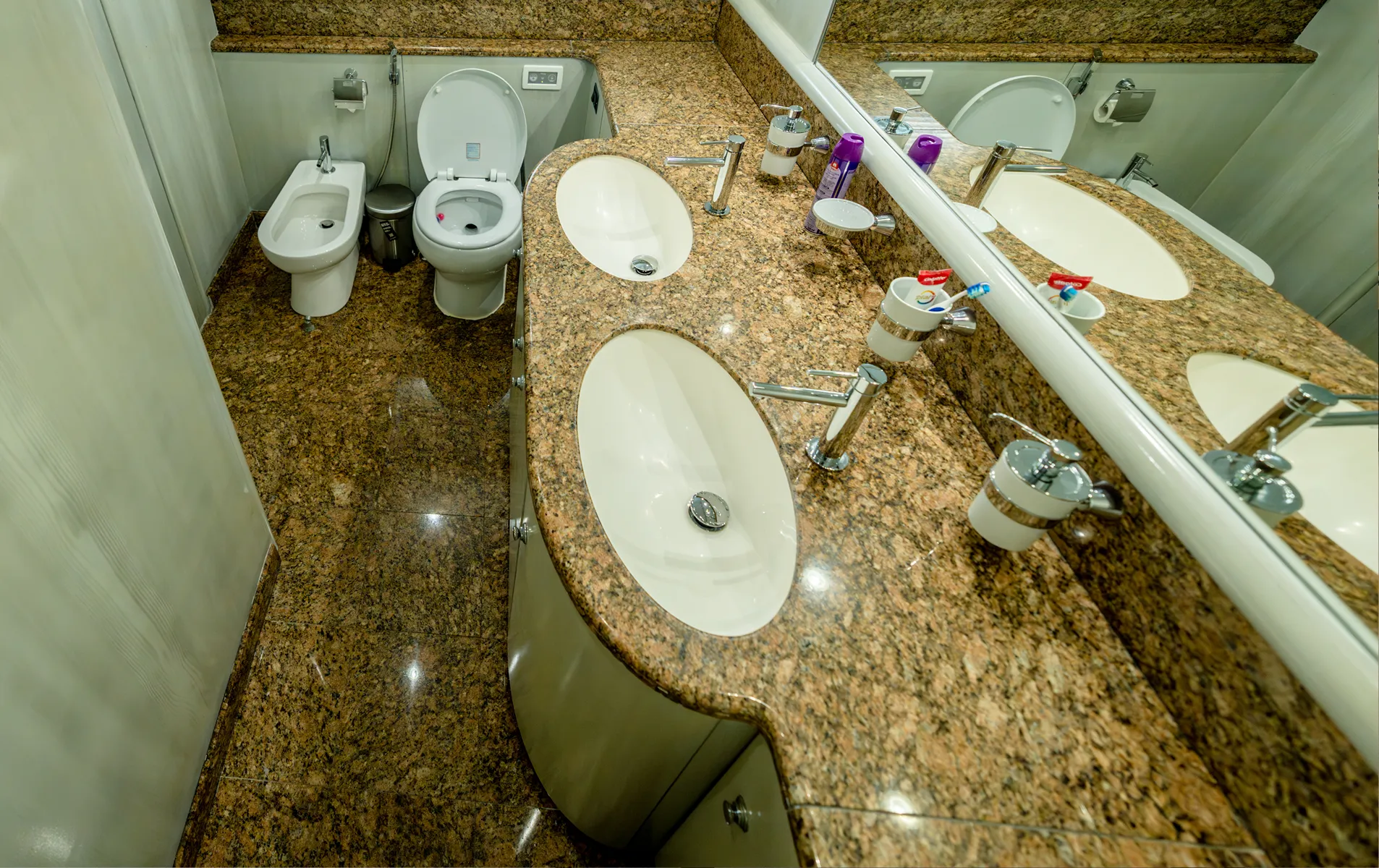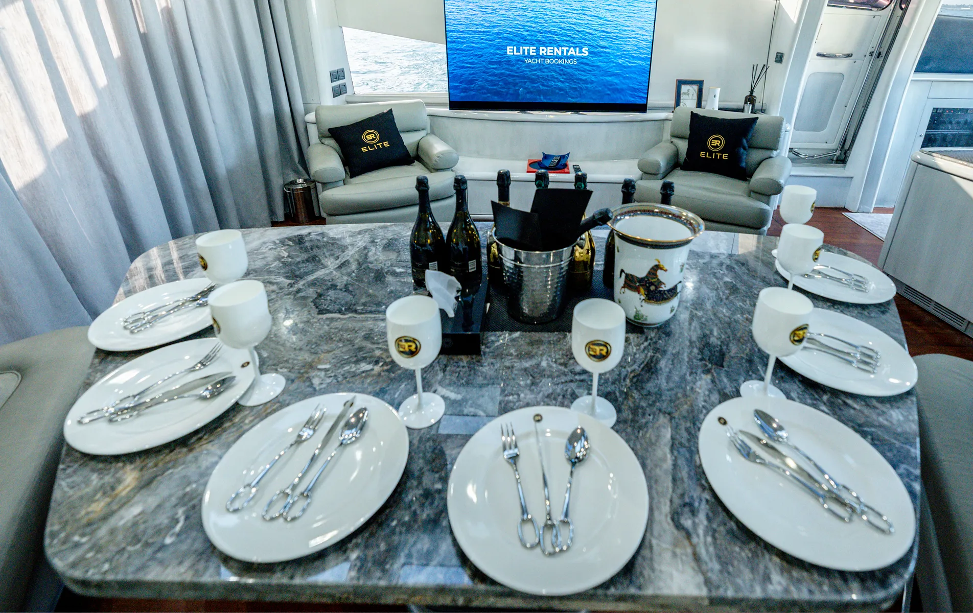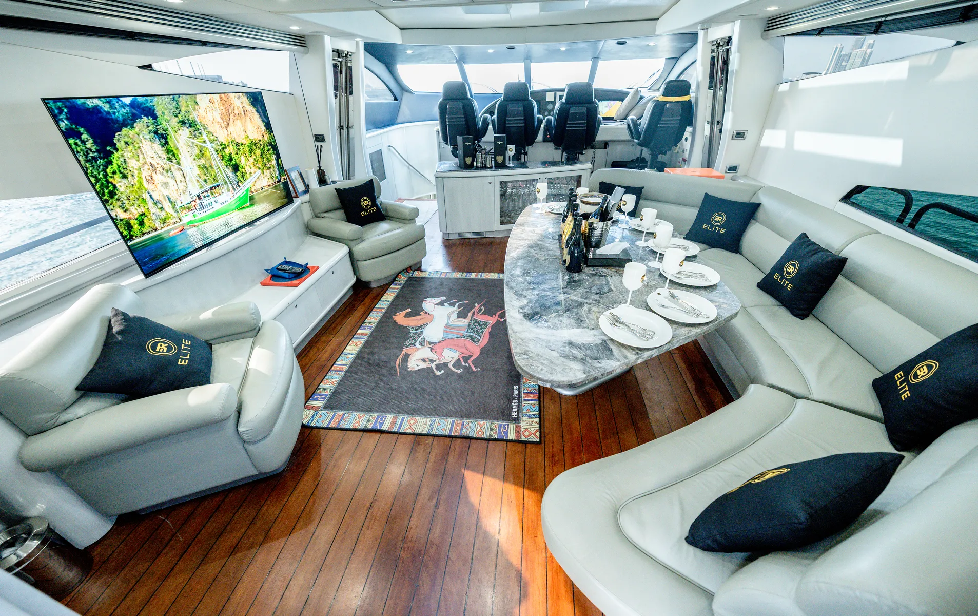 Internally, the yacht presents in elevated condition with new marble surfaces, new genuine leather seating, new ceilings, upgraded lighting, high-end decor elements, and premium brands including HERMES and BACCARAT throughout the interior styling. Six new Sony Smart TVs with Apple TV, PS5 entertainment system, karaoke sound system, and Italian BTICINO electrical fittings further modernize the onboard experience.