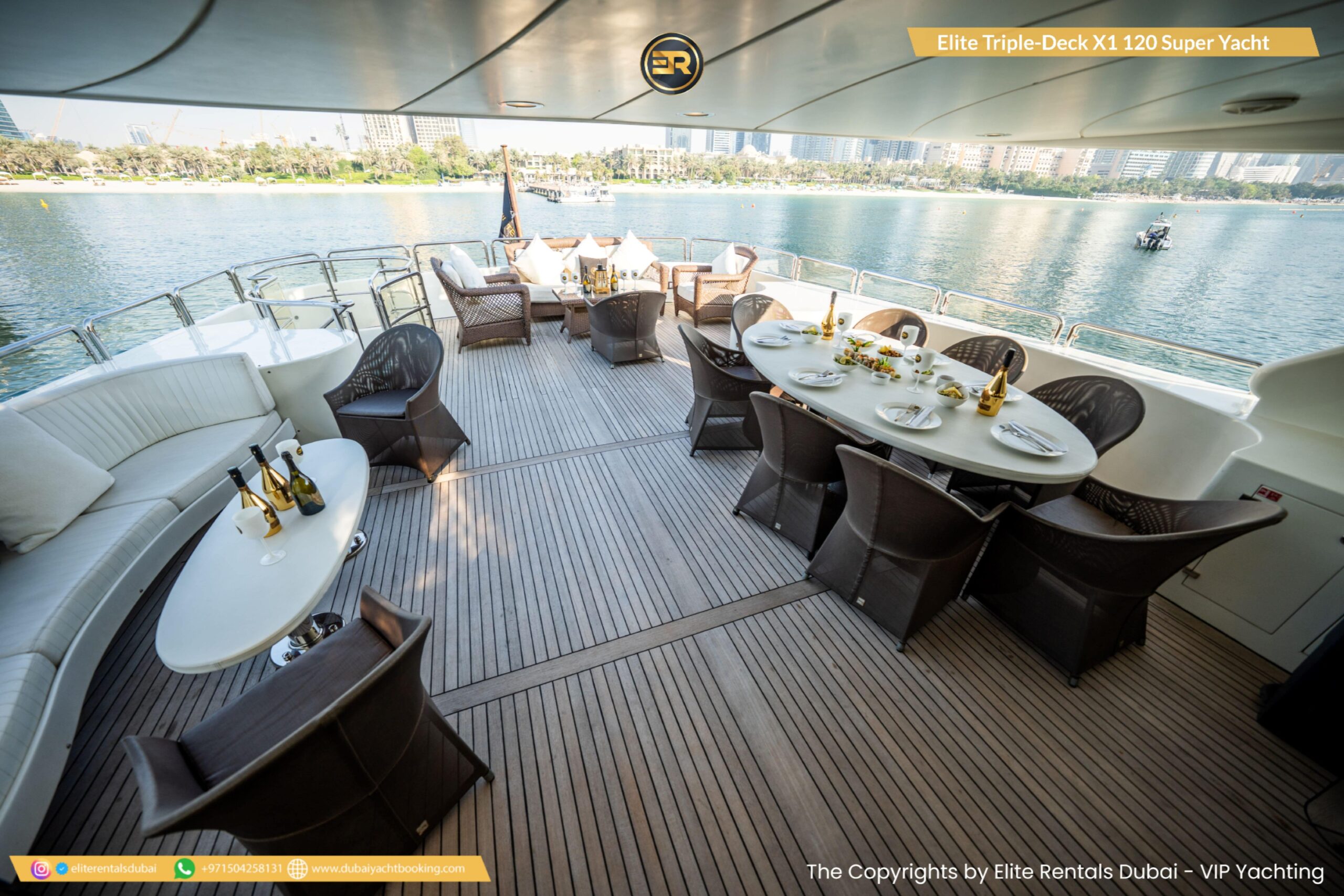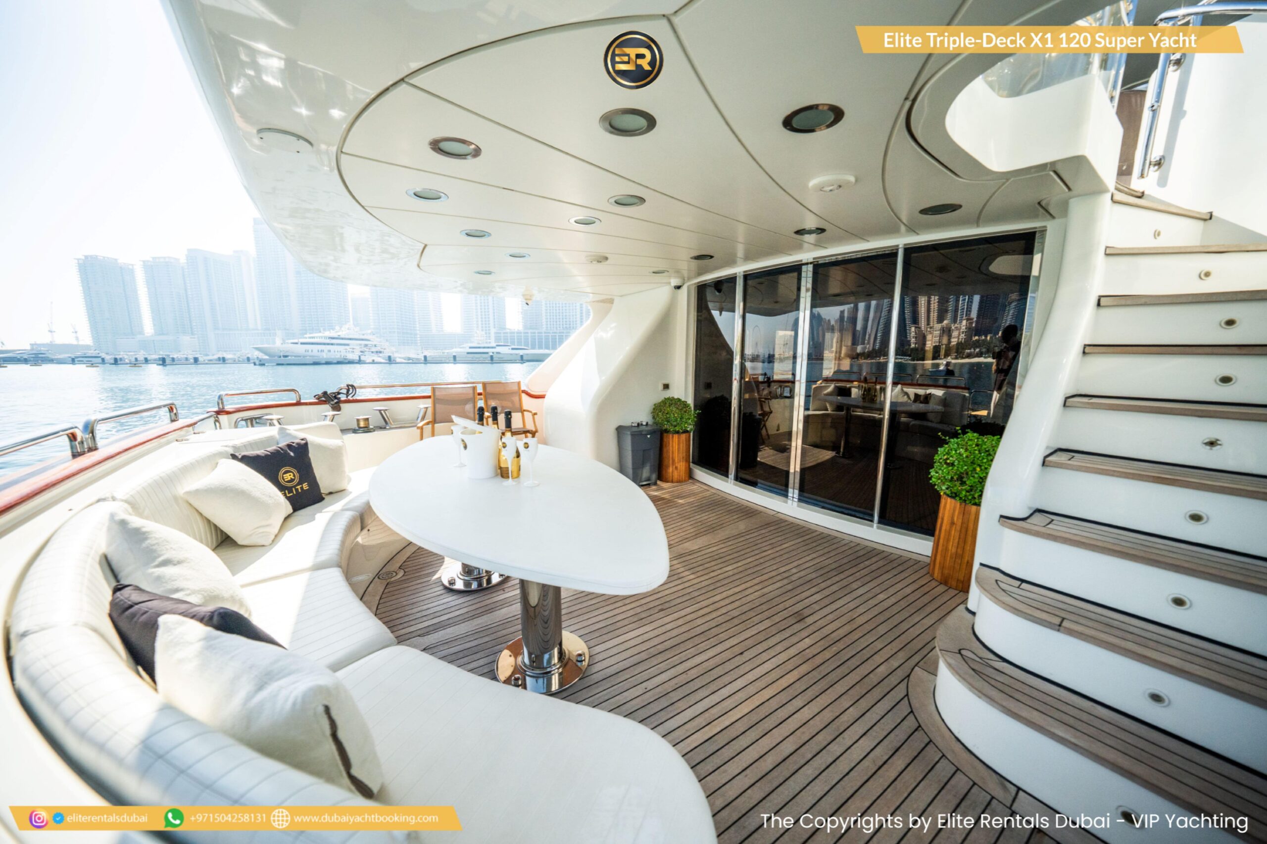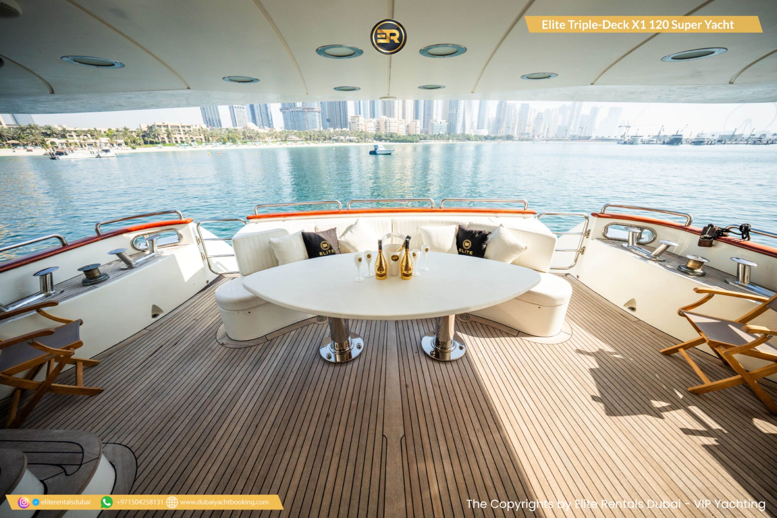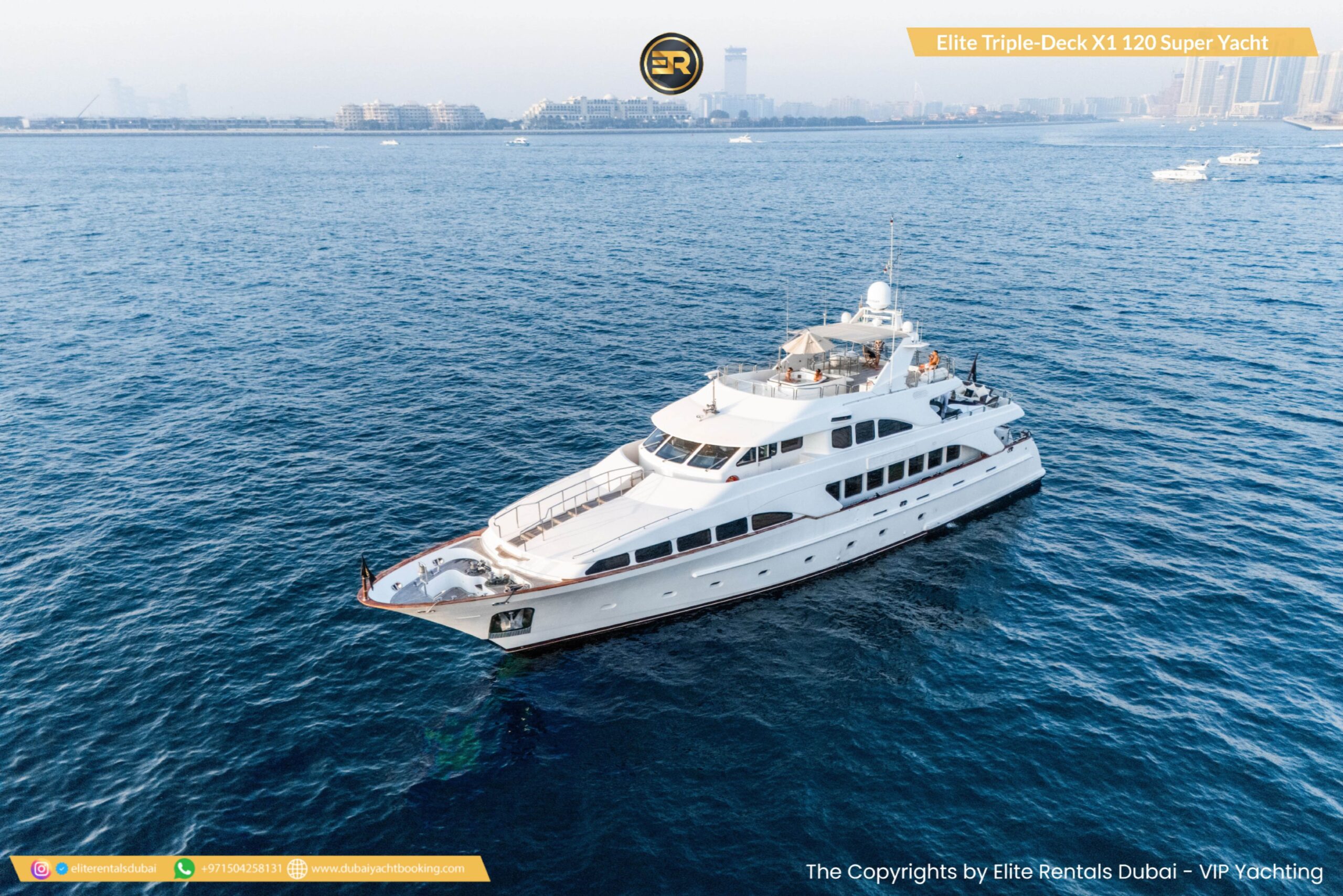 The Elite Triple-Deck X-350 Super Yacht VIP is built for those who expect the very best. With three grand decks offering space for dining, relaxing, and entertaining, it is ideal for hosting large groups or exclusive VIP events. The interiors feature beautiful design, comfortable suites, and all the amenities you could dream of at sea. Whether for a sunset cruise or a private celebration, this super yacht offers a perfect blend of elegance, power, and comfort. Experience pure excellence with Elite Rentals Dubai.