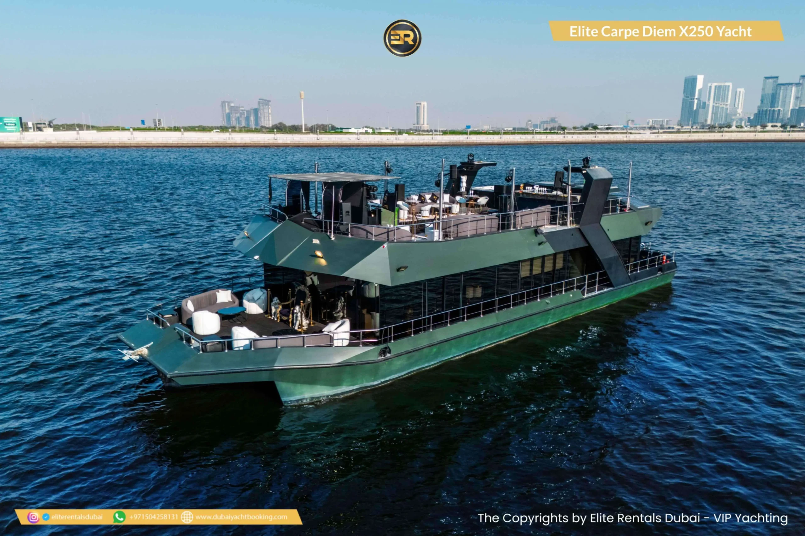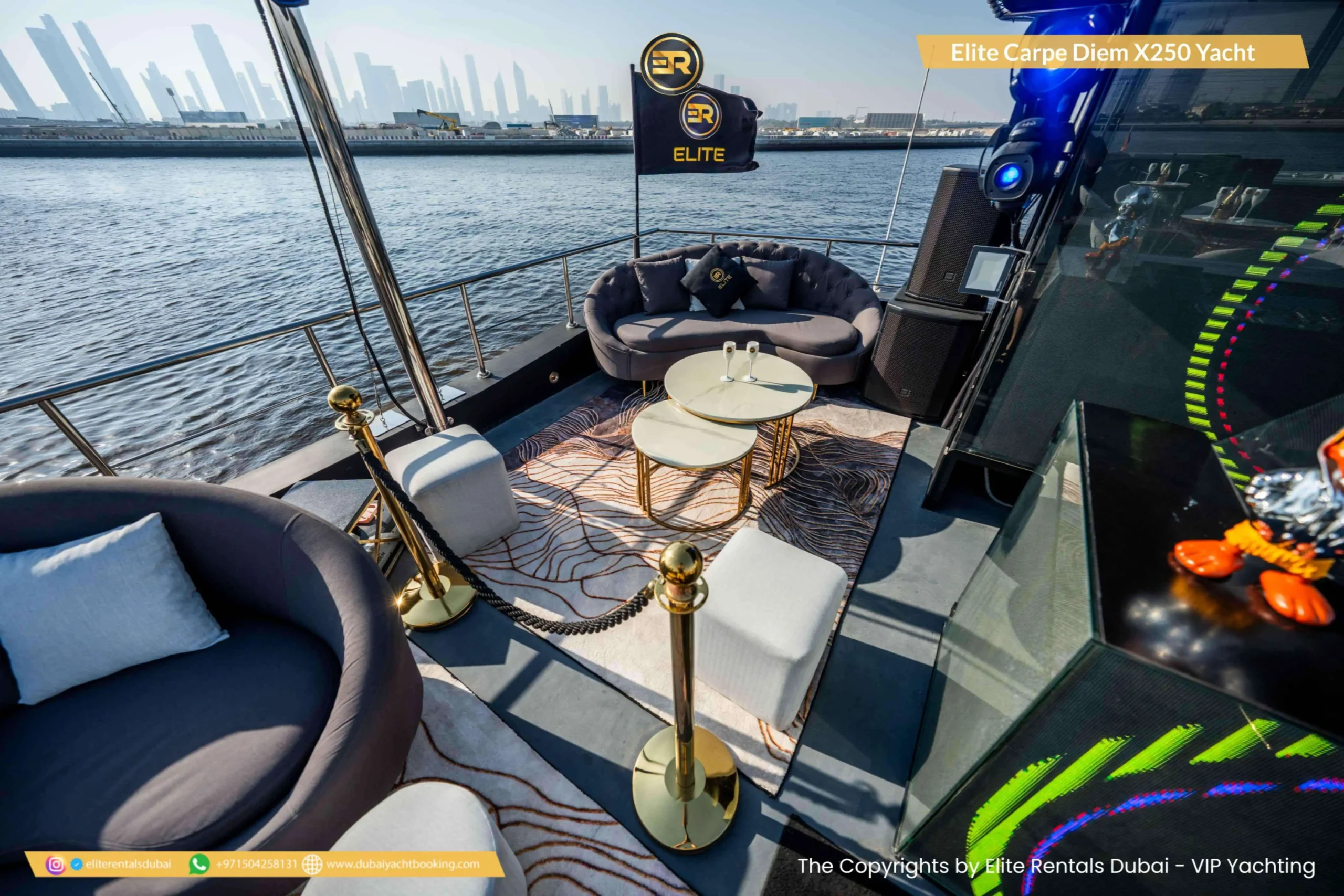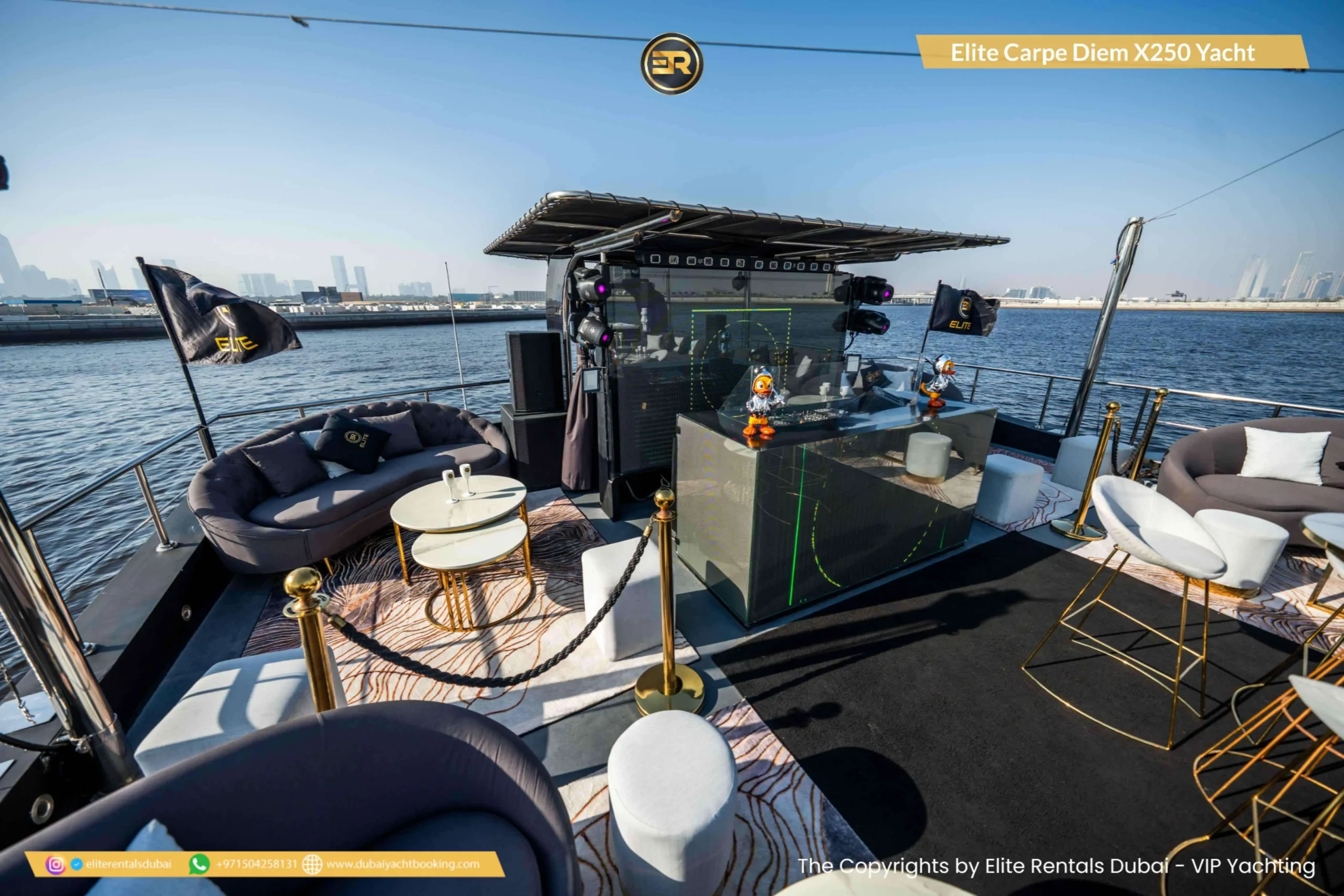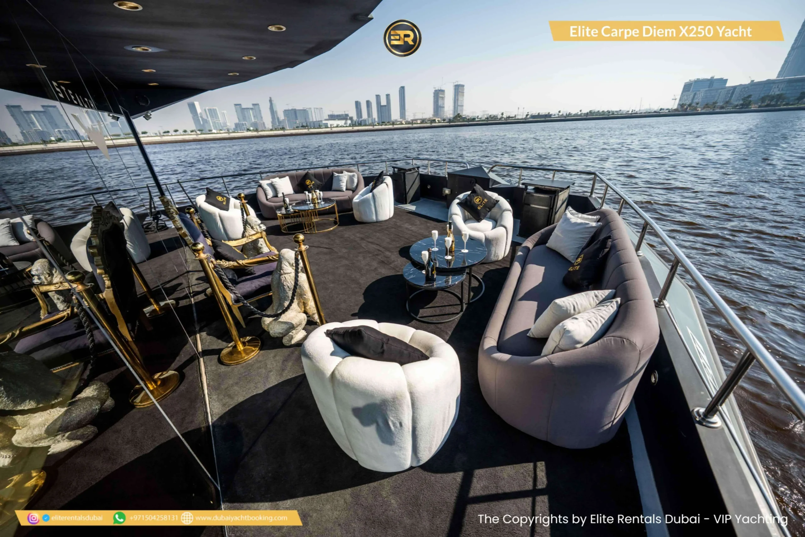 The Elite Carpe Diem Prestige X-250 Yacht is an opulent vessel offering everything you need for an extraordinary yachting experience in Dubai. This 250-foot yacht is ideal for large gatherings, corporate events, or luxurious private retreats. With expansive decks and stylish outdoor lounges, the yacht offers spectacular views of the Dubai skyline and coastline. Inside, the yacht features lavish lounges, sophisticated dining areas, and luxurious cabins designed for the ultimate comfort. The Prestige X-250 also offers advanced amenities, ensuring a seamless and memorable experience. Whether you’re planning a grand event or simply want to enjoy a day of luxury on the water, the Carpe Diem Prestige X-250 is the perfect choice. Book this stunning yacht today through Elite Rentals for an unforgettable experience.